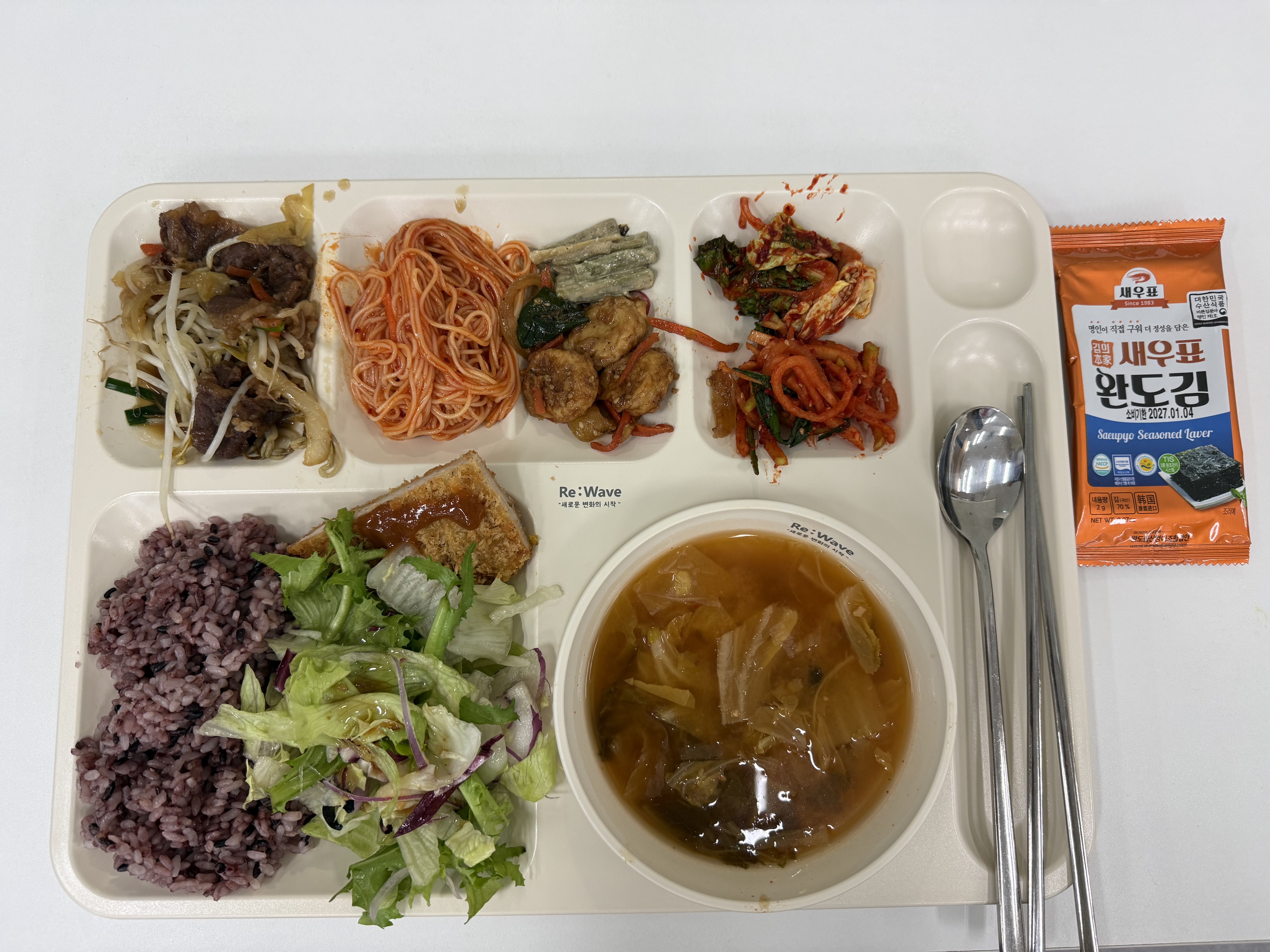 For the radish salad, the seasoning was a bit too strong for my liking. I prefer a cleaner and simpler taste. I hope for a more refreshing radish salad next time! The Pogi Kimchi was the usual delicious cabbage kimchi, and as for gim, well, no explanation needed, right? It's a rice thief!Overall, it was a meat-heavy meal, which was filling, but sometimes I do look forward to a more varied menu. I hope you also have a delicious lunch and stay energized!