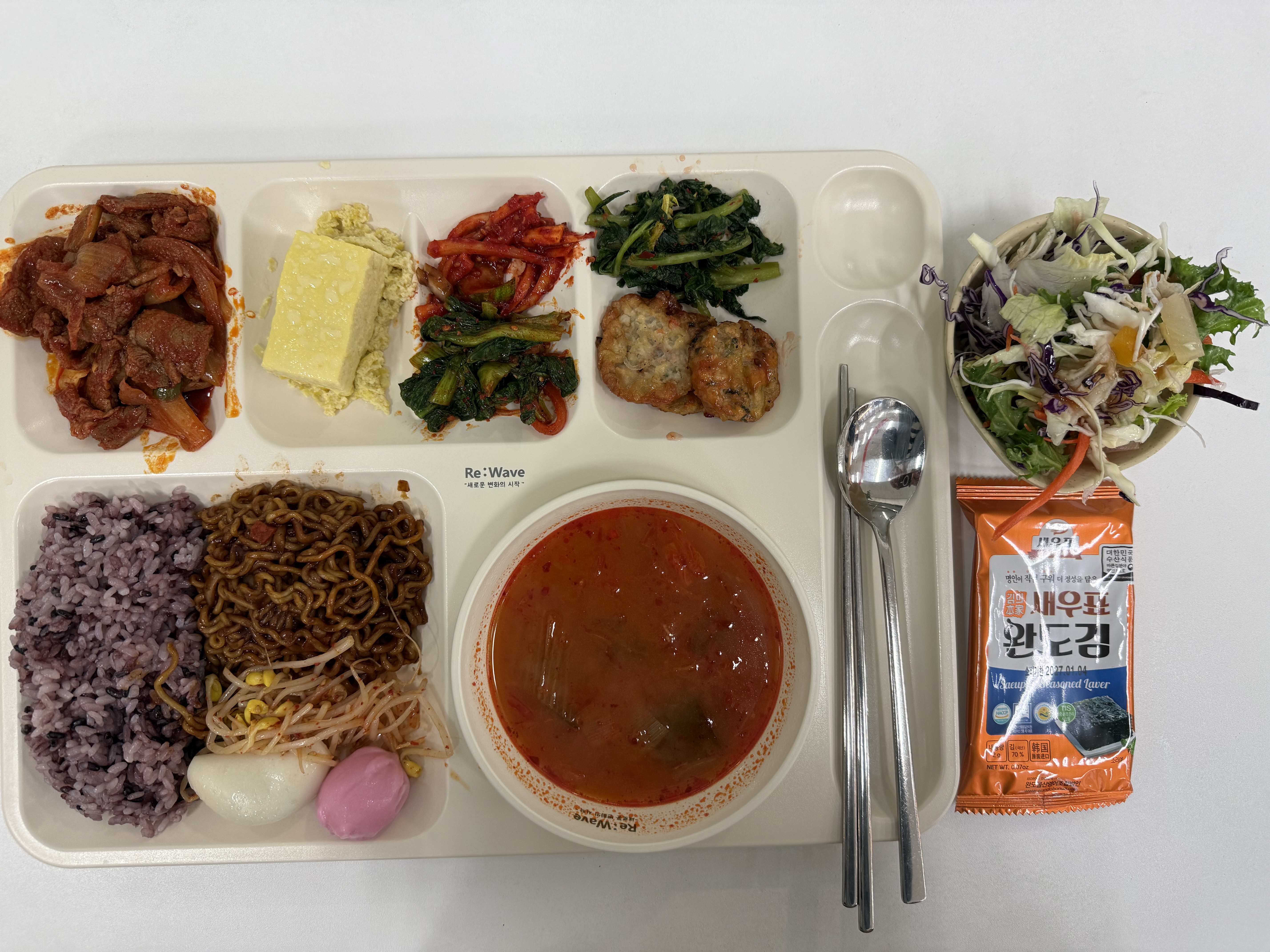 Today, the Jjapaguri really stood out. It was the first time it appeared in the cafeteria, and it was tastier than I thought, making Friday lunch even more enjoyable. Do you like Jjapaguri? Which dish from today’s tray would you most like to try?