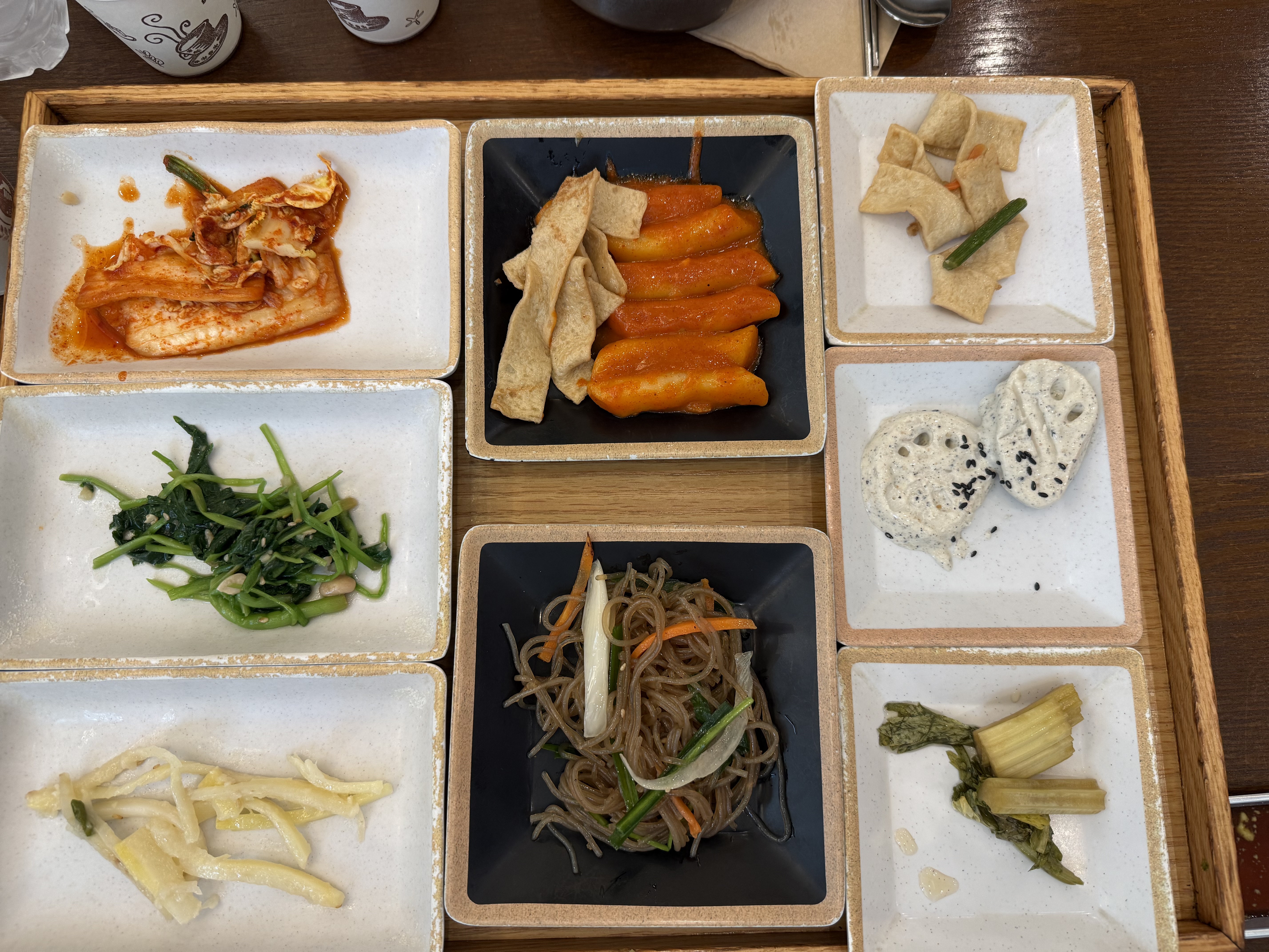 Kimchi, tteokbokki, stir-fried fish cake, lotus root, bellflower root, celery pickles, japchae.