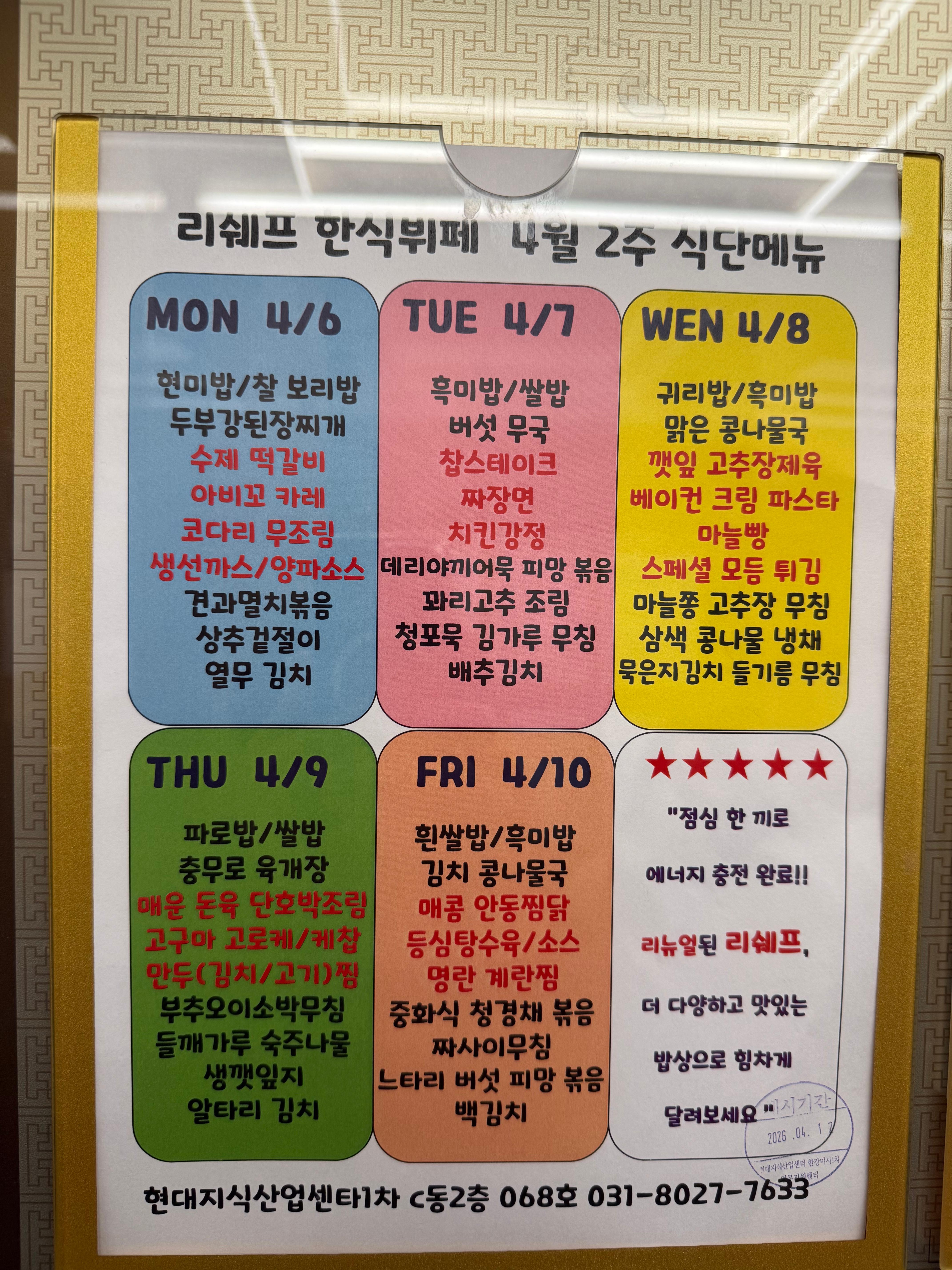 오늘은 짜장면이 특히 인기였고, 계란말이와 청포묵도 만족스러웠어요. 꽃샘추위로 조금 쌀쌀한 날이었지만 따뜻한 한식 한 끼로 기분 좋게 점심을 마쳤습니다. 여러분은 구내식당에서 나온 메뉴 중에 어떤 게 제일 끌리시나요? 특히 짜장면 좋아하세요?