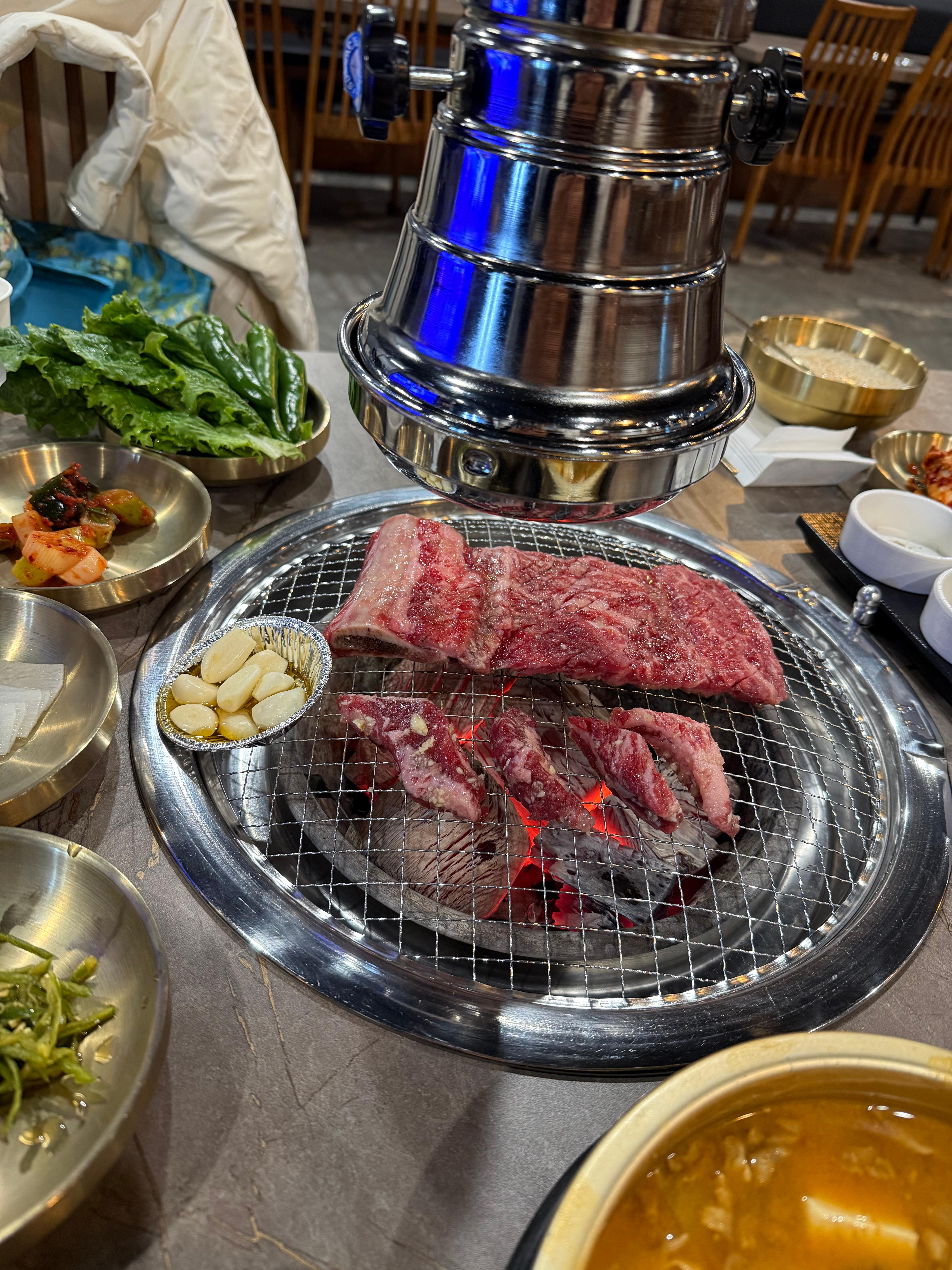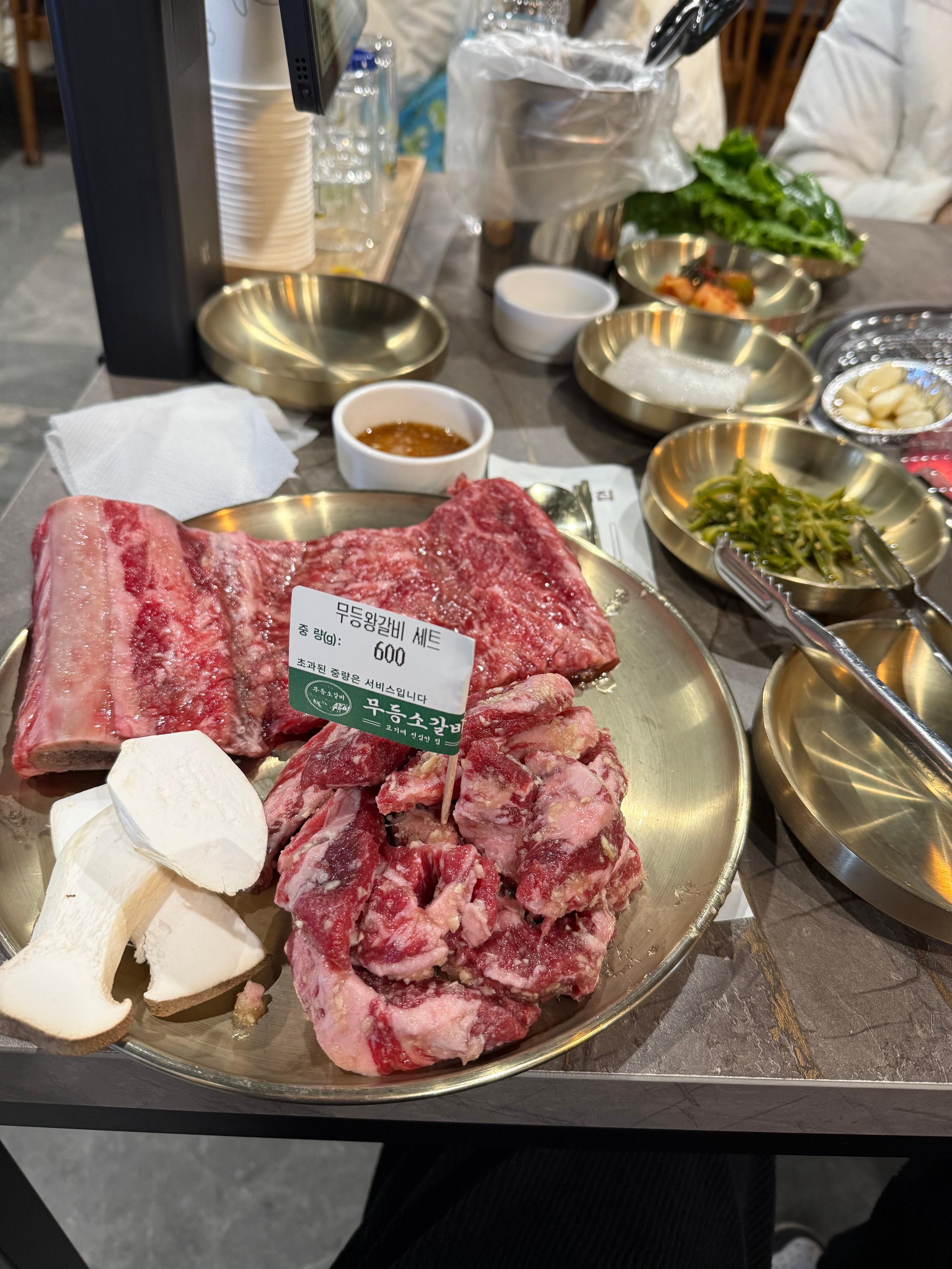 Our main course was the Mudeung King Galbi Set. The serving included one large king galbi rib attached to the bone, along with beautifully prepared galbi-sal (boneless rib meat). It was marinated galbi, but the marinade wasn't overly strong and the meat was incredibly tender, allowing the natural flavor of the beef to shine through with a perfect balance of sweet and savory. Even the kids thoroughly enjoyed it! The rich marbling and tender texture make it a dish that anyone, regardless of age, would love.