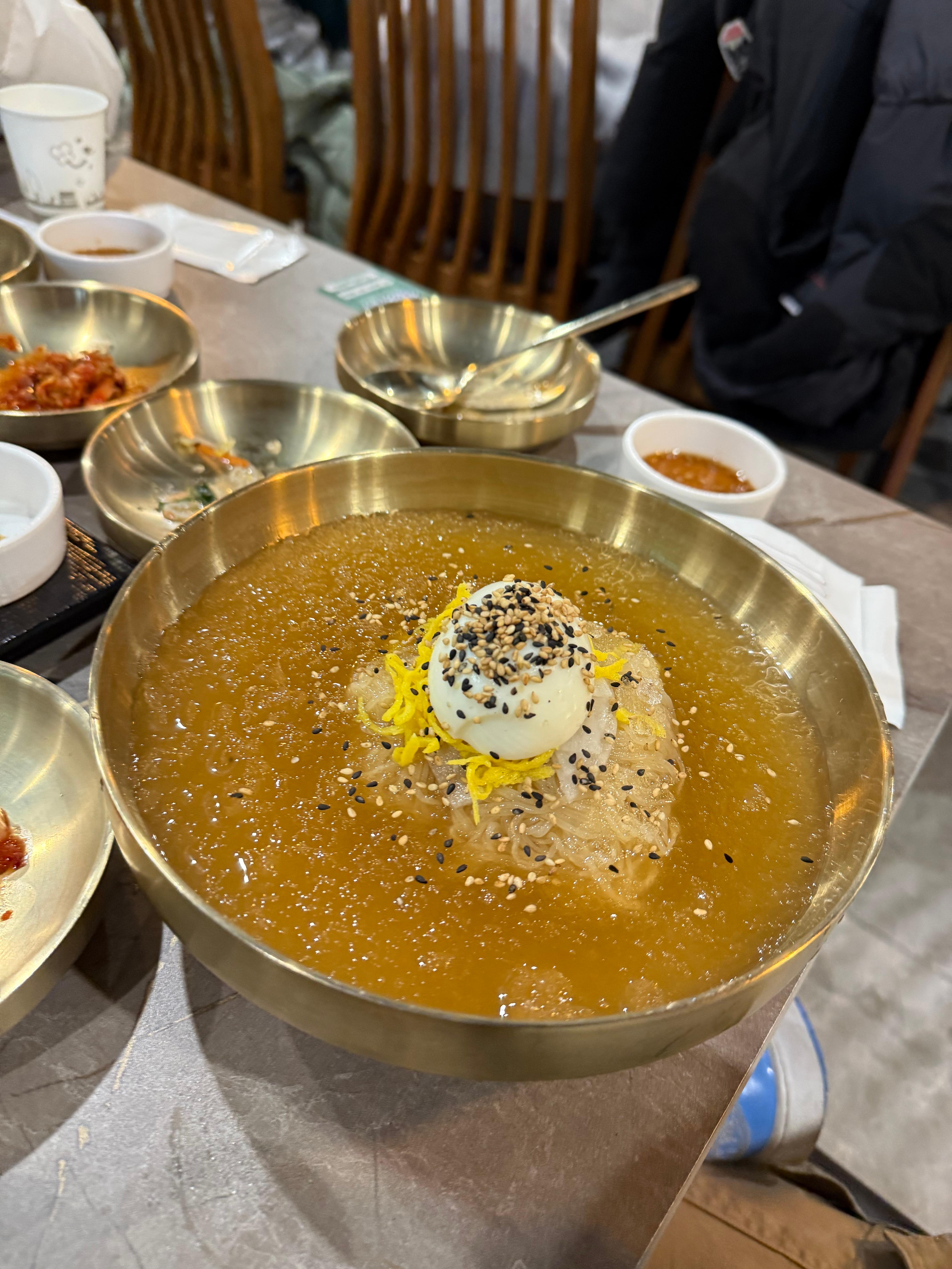 - This Mul-naengmyeon is my daughter's absolute favorite menu item. It's a cold buckwheat noodle dish served in an icy, refreshing broth. Even though it was a bit cold, kids always seem to crave something icy like this! ^^ Its cool and clean taste perfectly cut through the richness of the meat, making it the ultimate palate cleanser for the end of the meal.