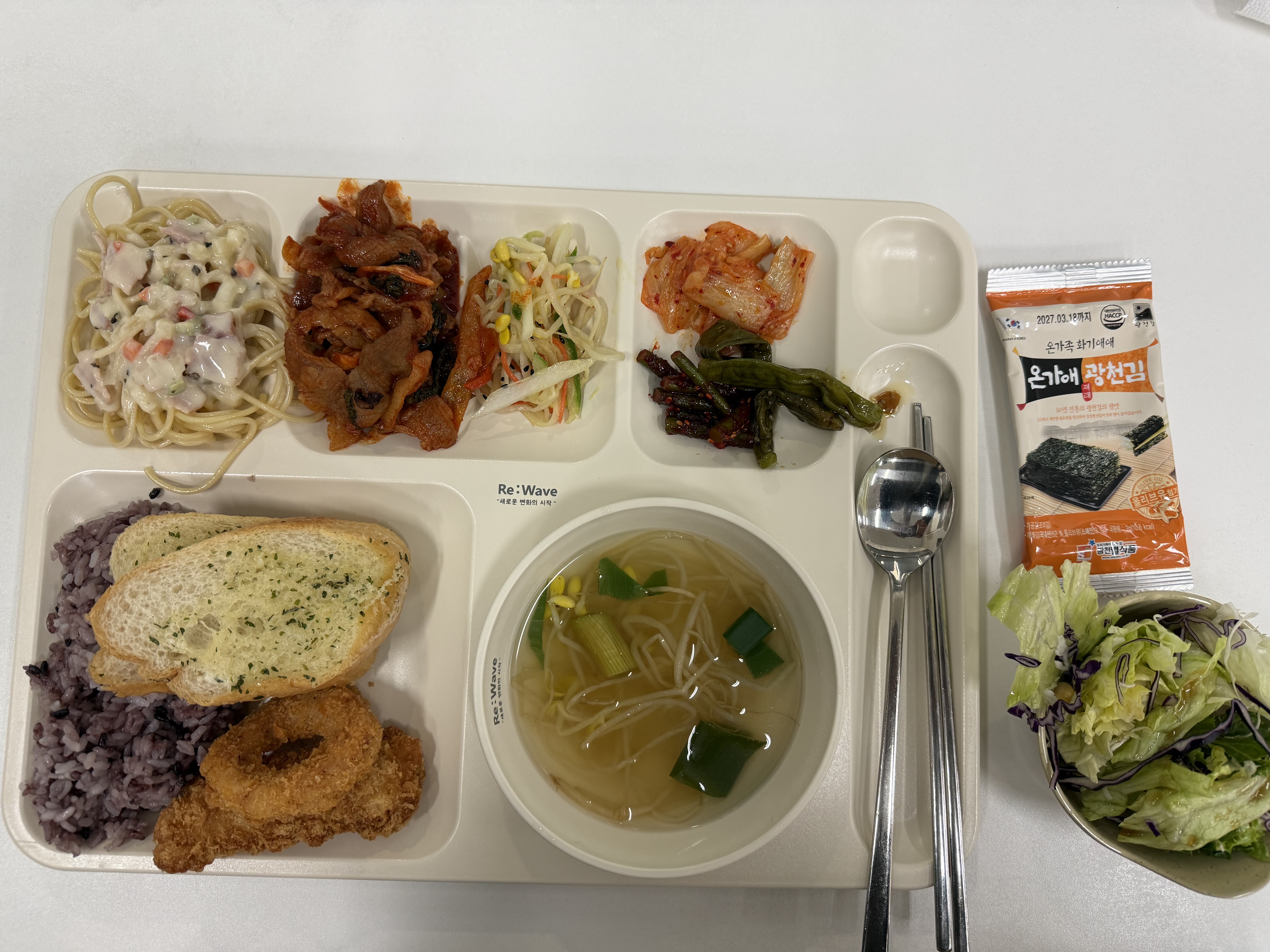 Today, the perilla leaf stir-fried pork and garlic scapes were especially delicious, and the bacon cream pasta was pretty good too. Spring weather is so changeable, but thanks to the warm and varied side dishes at the cafeteria, I had a very satisfying lunch. Do you like perilla leaf je-yuk? Which dish from today’s tray would you most like to try?